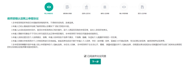 按钮,请仔细阅读教师资格认定网上申报协议,阅读完毕,请勾选下方
